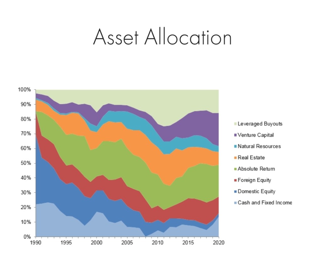 نرجع لموضوعنا الأصلي و هو جامعة يال و الوقف الخيري التابع لها اللى نما من ٥٠٠ باوند في القرن ال ١٨ إلى أن وصل لقيمة ٤٠ مليار دولار في ٢٠٢١. وقف جامعة يال اشتهر باستثماراته في مجالات غير تقليدية لأنه ما اكتفاش بالودائع النقدية و الأصول العقارية لكنه توسع في الاستثمار في الأسهم و الشركات الناشئة زي أمازون و جوجل و غيرها. بالإضافة لذلك إدارة الوقف بتستثمر في الأصول البديلة الإستثمارات البديلة غير المطروحة في أسواق المال تطبيقا لنظرية إن الاستثمارات دي بيكون تسعيرها أقل كفاءة من الأصول التانية المطروحة في الأسواق العمومية و بالتالي فرص المكسب الكبير بتكون أعلى.